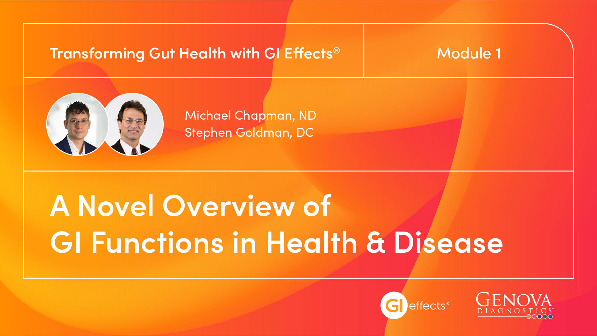 In this first session of Transforming Gut Health with GI Effects, our speakers provide a fresh perspective on GI dysfunction. Dr. Michael Chapman will introduce an easy-to-use model, simplifying digestion, absorption, gut immunity, and the microbiome to help tailor treatments effectively. Next, Dr. Stephen Goldman will review critical biomarkers from the GI Effects Comprehensive Profile, highlighting its clinical power. Don't miss this foundational session setting the stage for upcoming modules.