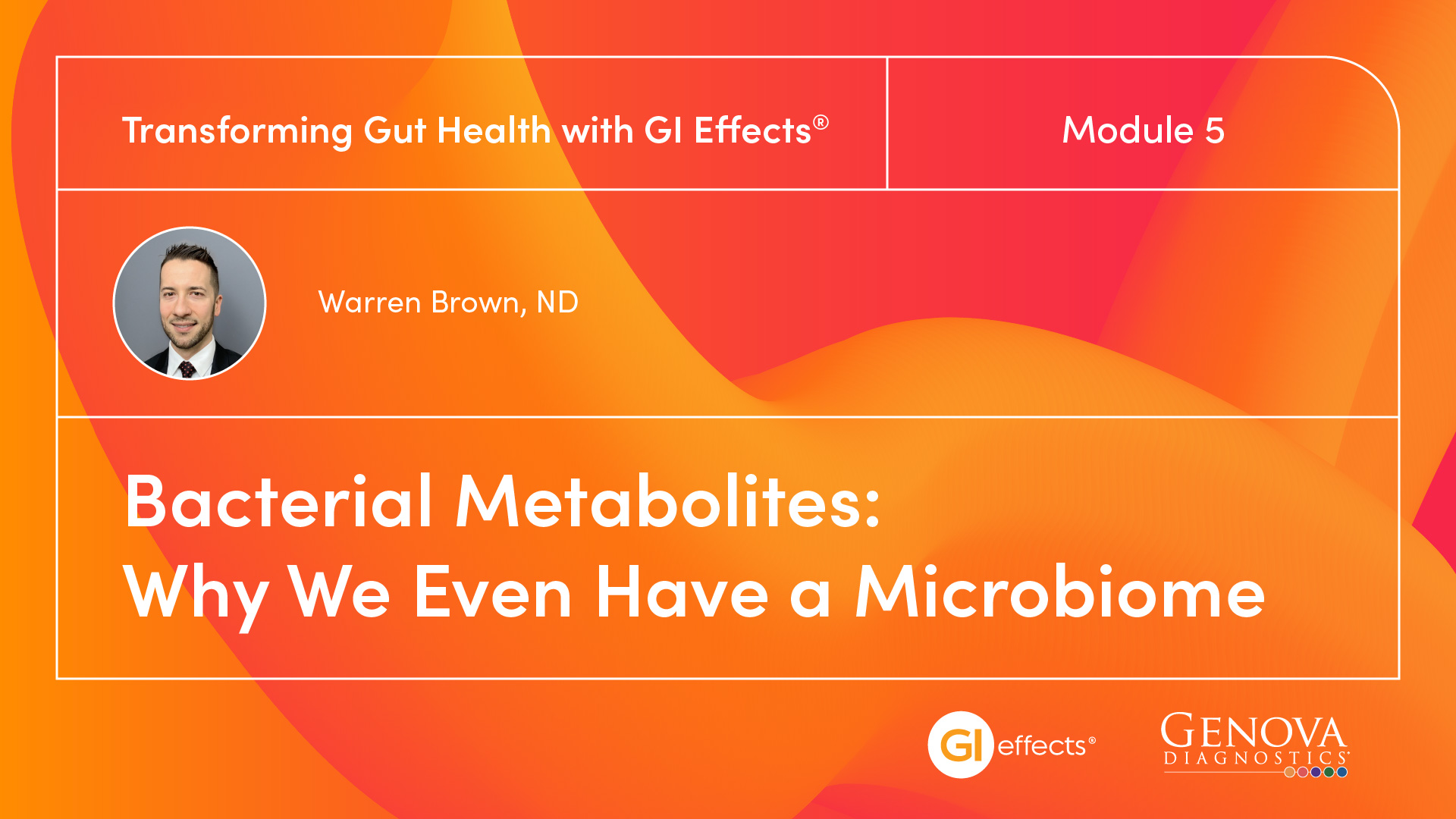 Many people focus on a laundry list of organisms present in the gut microbiome. However, what those organisms create (the metabolites) are actually the drivers of health or disease. From short chain fatty acid production to regulating hormonal balance, the gut metabolites are key. In this module, Dr. Warren Brown explains the vital role of gut metabolites on our health and ways they are assessed on the GI Effects Stool Profile and the Microbiomix Profile. Gain insight from Dr. Brown on how to support your microbiome not only for gut health but more importantly, optimal systemic health.